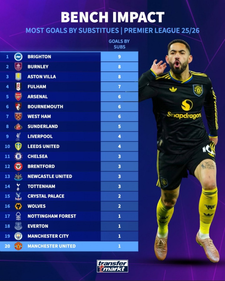 直播吧1月28日讯德国转会市场统计了本赛季各队后备 球员在英超赛事 中的得分 数量,并列出榜单,布莱顿9球居首,曼城、曼联1球垫底,曼联后备 球员唯一的得分 就是库尼亚对阵阿森纳的制胜球。