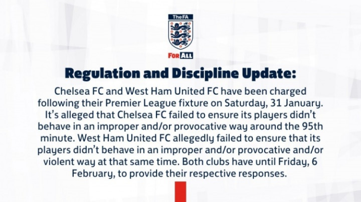 切尔西俱乐部未能确保其球员在第95分钟左右不出现不当及/或挑衅性行为。而西汉姆联俱乐部据称也未能确保其球员在同一时间不出现不当、挑衅及/或暴力行为。两家俱乐部须在2月6日周五之前分别作出回应。